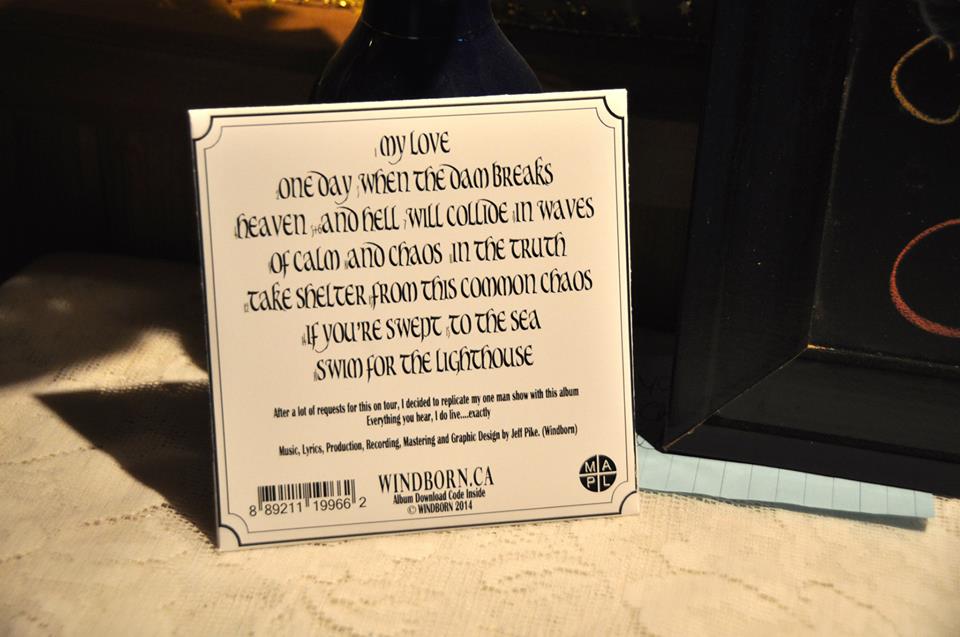 I know online downloads continue to be the mainstream way of acquiring music, but if you can get a hold of a physical copy of Calm in Chaos, it is well worth it. The album cover is a custom designed envelope with a Windborn seal and includes lyric sheets for each song, quite the labour intensive presentation for an independent artist. The writing, music, producing, recording, mastering, and design has all been done independently, as in all by himself.